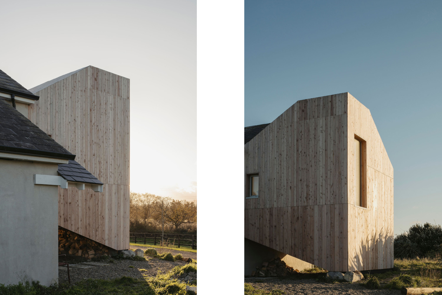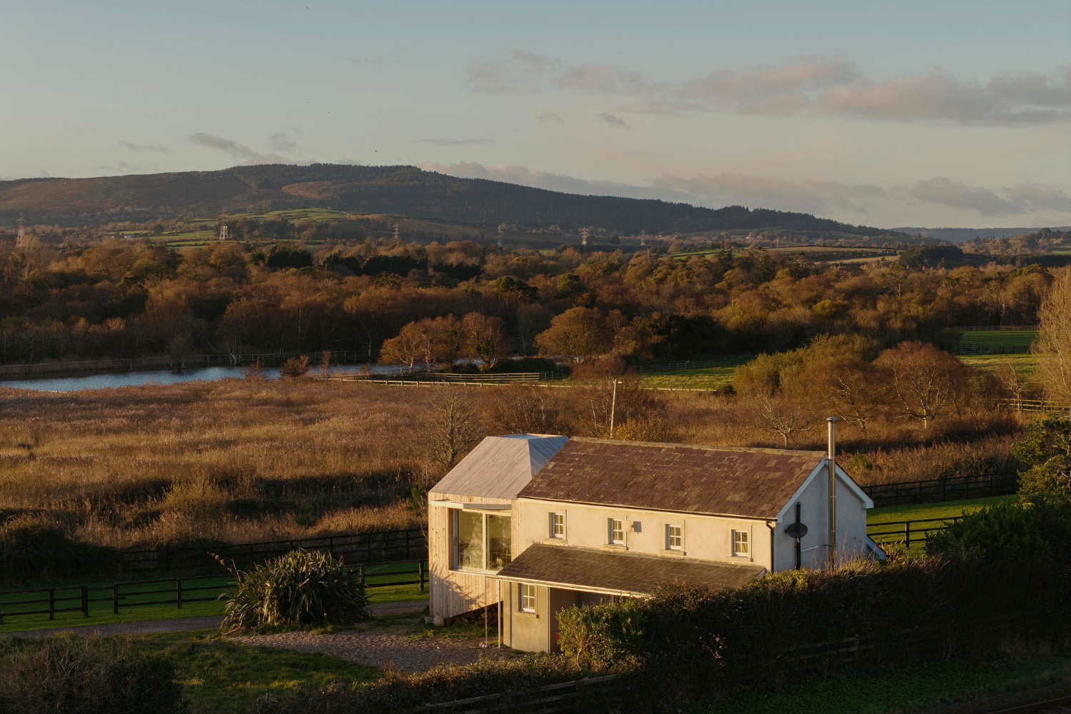 The architecture takes its inspiration from bird hides and railway architecture, as well as Irish agricultural buildings. The extension emulates the bird hide in the way that is raised off the ground and appears to float, taking in expansive views of the surrounding landscape, while the canopy roofs and materiality reference the railway architecture of the cottageās origins and agricultural setting of the building.